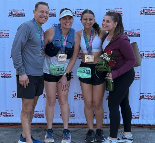 From left: Dr. Dave, wife Melissa, and daughters Katie and Emma finish the Tallahassee marathon together in 2025.